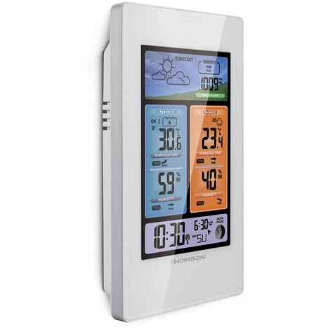 Optez pour une station météo ultra-complète avec cette station météo sans fil développée par la marque française Thomson. Il vous donne les prévisions météorologiques, la température extérieure et intérieure avec leur évolution, l’humidité extérieure et intérieure avec leur évolution, la pression atmosphérique avec son évolution, l’indice de confort, la phase de la lune, la date et enfin l’heure. Son écran coloré et rétroéclairé fait de cette station météo 513630 un objet utilisable 24 heures sur 24. Il dispose également d’une fonction réveil.